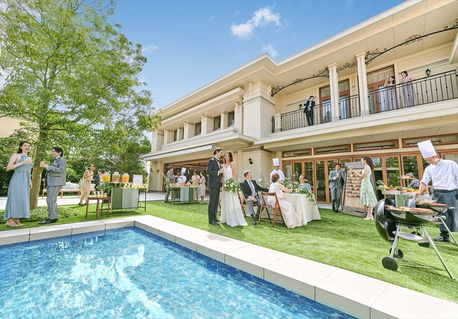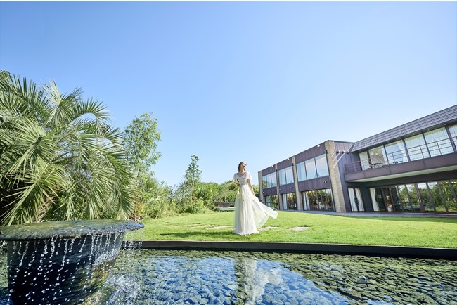 店舗紹介:豊橋市向山エリアにある、街の景色を一望できる完全貸切ゲストハウス。青空が映える広大なガーデンや、緑と水のきらめきが印象的なチャペルなど、1000坪の貸切邸宅で叶えるプライベートウエディング。
