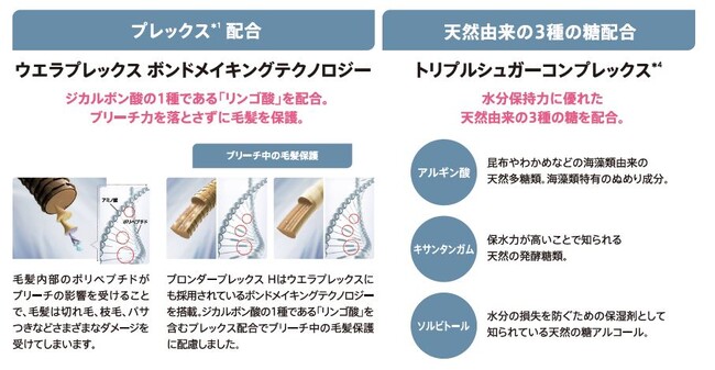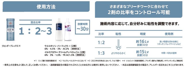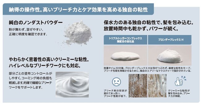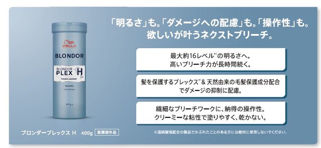 新登場する「ブロンダープレックス H」は業界トップクラス*2のリフト力を持つ、プレックス*1配合のハイリフトブリーチ。さらに、繊細なブリーチワークに適した納得の操作性で、ハイレベルなブリーチ施術をサポートいたします。