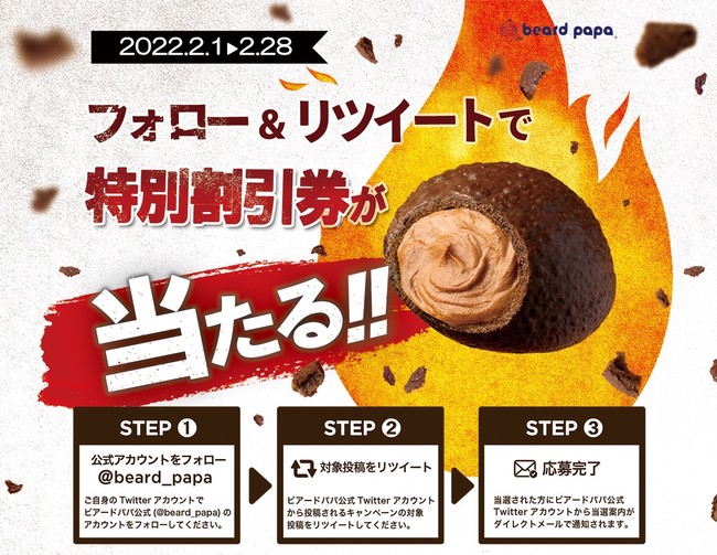 ビアードパパ公式Twitterアカウント「@beard_papa」をフォローし、対象ツイートをリツイートするとキャンペーンエントリーが完了、抽選で5名様にビアードパパで使える特別割引券が当たるキャンペーンです。