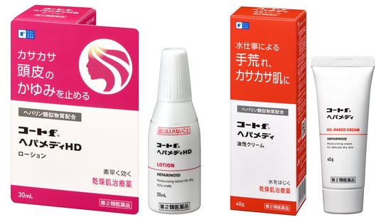 「コートf(R)ヘパメディHD」と「コートf(R)ヘパメディ」は、ヘパリン類似物質を配合した乾燥肌治療薬です。ヘパリン類似物質が肌の奥まで浸透して水分を抱き込み、肌の内部から保湿することで、肌機能を正常化します。「コートf(R)ヘパメディHD」はかゆみを伴う頭皮の乾燥に、「コートf(R)ヘパメディ」は水仕事による手荒れに、それぞれ効果を発揮します。