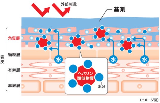 親水性を持つヘパリン類似物質は水分子を引き寄せ保持する保水性に優れ、皮膚の奥まで浸透し保湿する効果があるため、乾燥による皮膚炎などに対して効果を発揮します。保湿効果のほか、血行促進、抗炎症効果をあわせ持っています。