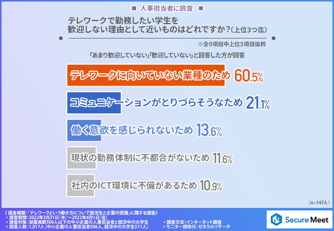 そこで、先ほどの質問で『あまり歓迎していない』『歓迎していない』と回答した人事担当者に対し、「テレワークで勤務したい学生を歓迎しない理由として近いものはどれですか?(複数回答可)」と質問したところ、『テレワークに向いていない業種のため(60.5%)』と回答した方が最も多く、次いで『コミュニケーションがとりづらそうなため(21.1%)』『働く意欲を感じられないため(13.6%)』と続きました。