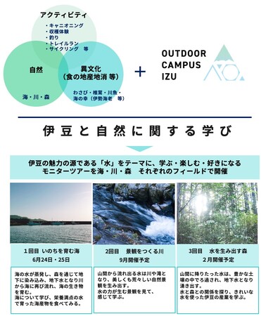 豊かな森林と清らかな水に恵まれた山紫水明の地である伊豆市。その清らかな水と共に人々の生活や文化が育まれてきました。伊豆市を語る上では欠かせない「水」をテーマに、いのちを育む「海」・景観を育む「川」・水を生み出す「森」それぞれのフィールドで、キャンプをしながら、伊豆の自然・アクティビティ・食の体験を通じて楽しみながら親子で学べるモニターツアーを開催します。モニターツアーは1回だけでも参加可能ですが、3回参加することで、水の循環や水と共に伊豆に根付く文化や歴史をより深く知ることを可能とし、伊豆と自然に関する学びが深まることを目指します。