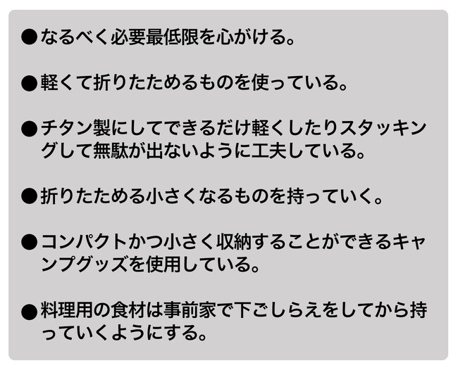 6割以上のキャンパーはキャンプの荷物を減らしたいと考えているものの、その8割は何も工夫していないという調査結果でした。