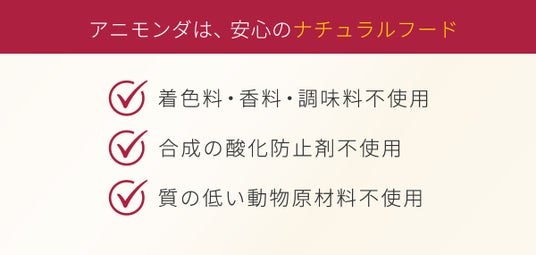 これらを厳守しており、アニモンダは安心・安全を徹底したナチュラルフードです。
