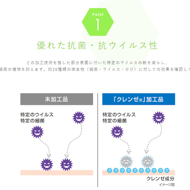 抗菌・抗ウイルス素材のクレンゼ(R)は、インフルエンザウイルス、アデノウイルス、ノロウイルスや大腸菌(O-157)など約20種類以上の微生物を99%以上減少させる効果のある機能素材です。口に使用する消毒液を元にした安全な技術で、医療現場でも医師の白衣や看護師の制服、入院患者が過ごすベットシーツなどにも使用されています。抗菌・抗ウイルス機能は50回の洗濯まで100%持続致します(それ以降のデータはございません)。
