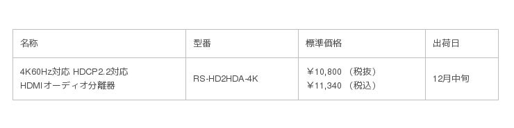 ラトックシステム株式会社(本社:大阪府大阪市浪速区、代表取締役社長:岡村周善、以下ラトックシステム)は、4K 60Hz(4:4:4 / 24bit)の映像信号に対応した、HDMIオーディオ分離器「RS-HD2HDA-4K」を、12月中旬より発売いたします。