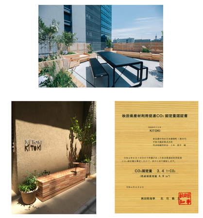 「KITOKI」の外構や屋上には地域連携として、株式会社日本取引所グループ(以下「JPX」という)が社会貢献活動の一環として推進する「東証上場の森」が所在する秋田県由利本荘市矢島地区の木を使用した「kabulock」(多種用途に活用可能なブロック加工した木材によるベンチ)を設置。
