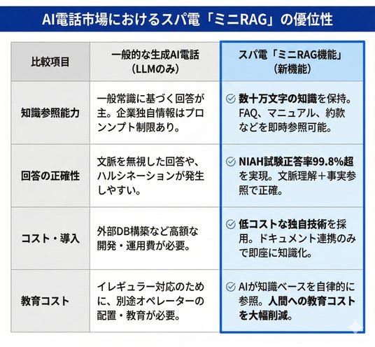 本機能は、数十万文字におよぶ企業固有マニュアル・FAQ・業務ルールをAIが保持し、通話中に即座に参照・判断を行う仕組みです。
