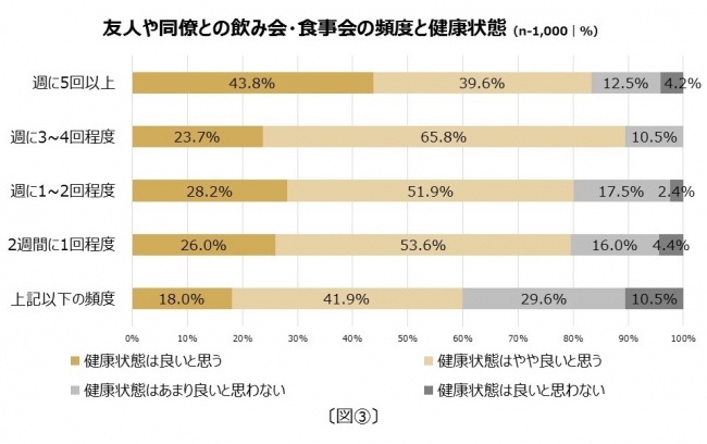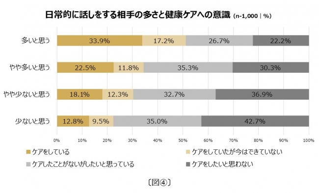 今回の調査で、自身が社交的だと思っている人のほうが健康状態が良いと感じており[図1.]、実際に日常的に話しをする相手(対面での会話だけではなくメールや電話、SNSでのコミュニケーションも含む)の数が多い人ほど、健康状態を良く感じていることが分かりました[図2.]。また、友人や同僚との飲み会・食事会の頻度で見ると、健康状態を「良い」と回答している割合が最も高いのは週に5回以上行く人で、「やや良い」と答えた人を合わせると、週に3~4回程度が最も多くなりました[図3.]。さらに、日常的に話しをする相手が多い人ほど、実際に健康へのケアをしていることも明らかに[図4.]。ときに、会社や学校、SNSなど人とのつながりはストレスの原因にもなりますが、身近な人との積極的なコミュニケーションを心がけたいものです。