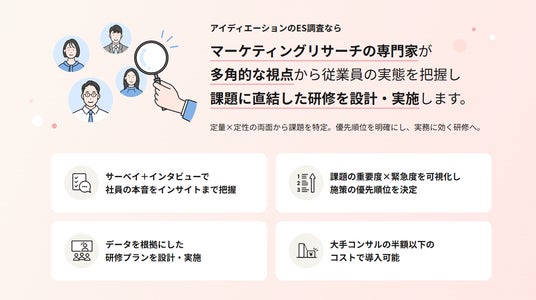 マーケティングリサーチ事業を展開する株式会社アイディエーション(本社:東京都渋谷区、代表取締役:白石章兼、以下「当社」)は、従業員の本音を可視化する「ES(従業員満足度)調査」から、その結果に基づいた「オーダーメイド型研修」までを一気通貫で提供する新サービスをローンチいたしました。