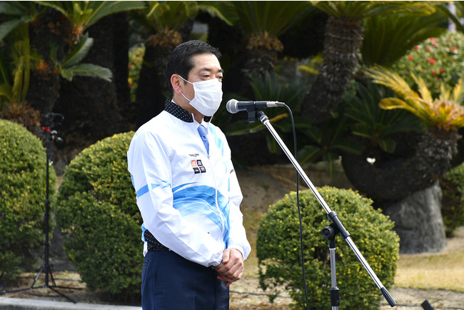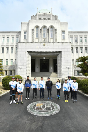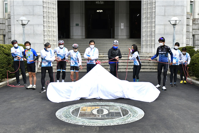 モニュメントは(一財)自転車新文化基金會(会長:羅祥安(トニー・ロー)氏)の協力を得て制作され、2022年3月12日(土)、愛媛県庁本館前でモニュメントのお披露目セレモニーを行いました。中村時広(なかむら・ときひろ)愛媛県知事は「さまざまな取り組みを行ってきた四国一周サイクリング事業はまだまだ伸びしろが大いにあると感じている。これからチャレンジするサイクリストの方には素晴らしい道のりを体感してほしい」と四国一周サイクリングの更なる発展への想いを述べました。