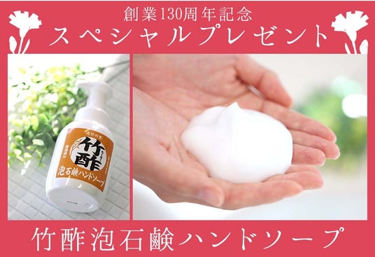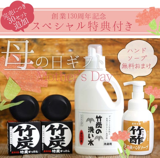 「母の日ギフトセット」は、竹炭を原料としたお肌にも環境にもやさしい自然派洗剤「竹炭の洗い水」と「虎竹の里 竹炭石鹸」2個がセットになっており、さらに竹虎創業130周年記念として「竹酢泡石鹸ハンドソープ」を1本無料でプレゼントしています。