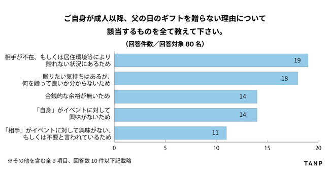 贈りたい物のイメージがあるが、適した商品が見つからないため 9/父の日以外の機会にギフトを贈ることがあるため 6/ギフトを考える時間が無いため 3/その他 0