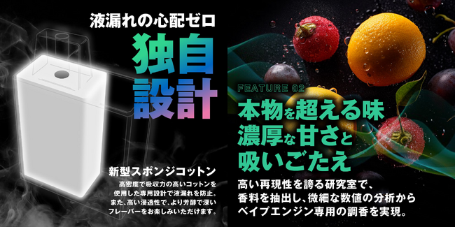濃厚なミストが吸った瞬間口中に広がり、まるで本物のフルーツやドリンクを飲んでいるかのような感覚になります。