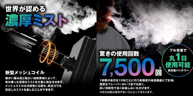 現行機のベイプエンジンは5,500回使用可能となっており、類似品よりも長くお楽しみいただけると好評をいただいておりましたが、新型になったことでさらに「2,000回」も使用回数が増え、さらに長くお楽しみいただけます。