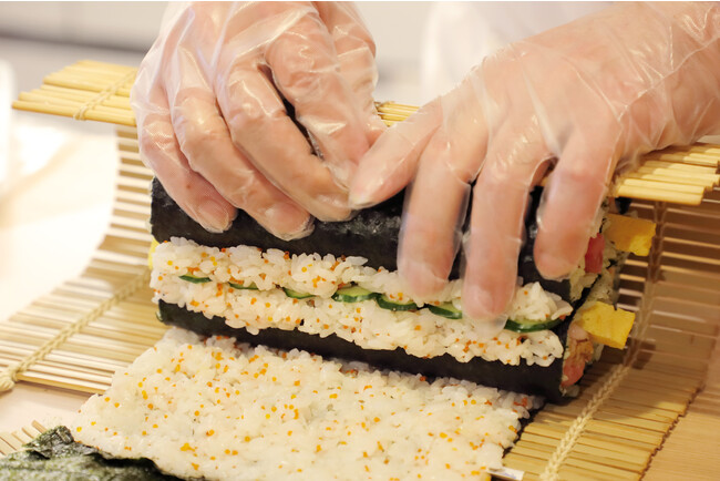 会場では、直径が9.5cmもある「幸せを呼ぶ!クローバー海鮮絵巻」をその場で巻きあげる実演が行われました。 人気の海鮮巻をベースにし見た目にも幸せな気分になる大きな四つ葉のクローバーは、家族や友人とシェアして食べるのにぴったりな商品となっております。