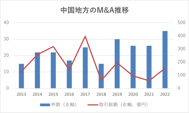 中国地方(広島県、岡山県、山口県、鳥取県、島根県)の2022年のM&A件数(売り手、買い手、対象のいずれかが中国5県に拠点を置いている案件の件数)は、前年比9件増の35件で、コロナ禍前の2019年の30件を3年ぶりに上回り、2013年以降の10年間では最多となりました。