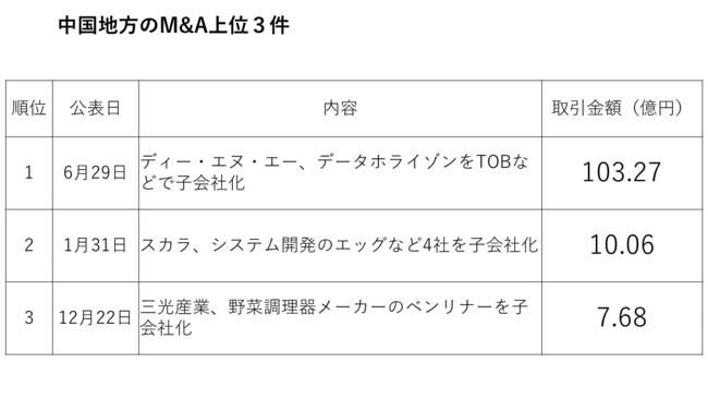 2位はスカラ(東京都渋谷区)がシステム開発のエッグ(鳥取県米子市)などグループ4社の全株式を10億円で取得し、完全子会社化する案件です。地方創生、高齢者の健康といった社会課題をビジネスで解決する取り組みを推進するのが狙いとなります。グループの中核会社のエッグは、ふるさと納税制度に関する自治体側の基幹システムを業界で初めて開発。全国の3分の1にあたる約680自治体が採用しており、シェアトップとされています。