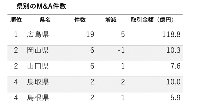 前年ゼロ件だった鳥取県は2件となり、4位に。金額は前年の0円から10億円となり、こちらは山口県を追い抜いて3位に浮上しました。島根県は前年の1件から2件に増え、取引金額は5億9000万円でした。