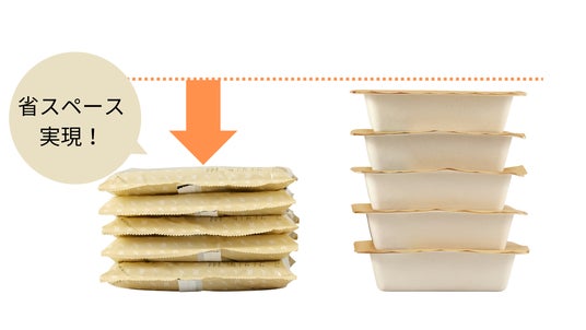 冷凍庫の空きスペースを活用できる薄型トレーを採用した kanau(左)、他社品(右)よりも冷凍庫での場所を取らない