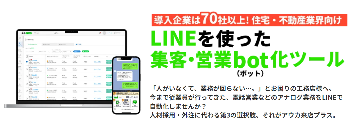 来店プラスは、住宅業界に特化した集客・営業のbot化ツールです。イベント予約数のアップから、資料請求のランクアップ、再来場案件の引き上げ、OB紹介・業者紹介の獲得まで、住宅メーカーや工務店の集客に必要な機能をすべて揃えて自動化したオールインワン型で集客・営業支援いたします。