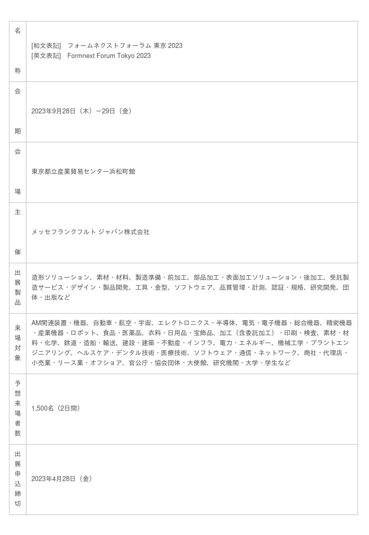 メッセフランクフルト ジャパン株式会社(代表取締役社長:梶原靖志)は2023年9月28日(木)-29日(金)の2日間、東京都立産業貿易センター浜松町館にて開催する「フォームネクストフォーラム 東京 2023」の出展者募集を開始しました。ドイツ・フランクフルトで毎年開催されるAM(積層造形)技術と工業用3Dプリンティングに特化した国際専門見本市「フォームネクスト」の姉妹イベントとして、前回は65社の企業・団体がAM関連の製品やサービス、材料、製造・加工技術などを披露し、1,180名の業界関係者を迎えました。会期中は展示以外にも、業界関係者向けのセミナー・カンファレンスが連日開催されます。「フォームネクストフォーラム 東京」はAM業界での販路拡大に最適なプラットフォームを提供しさらなる業界の活性化に貢献します。