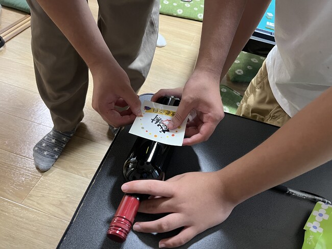 ワインやビール、日本酒など多様な種類のドリンクから祖父母の好みのものを選び、スマートフォンアプリを用いて感謝の気持ちをボトルデザインに表しました。ラベル完成後は、貼り付け、梱包も生徒自身で行いました。