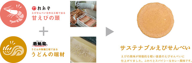 桂新堂から出る「甘えびの頭」と若鯱家から出る「うどんの端材」という、使いきれなかった部分をつかってSDGs・食品ロスについて考えながら美味しさにこだわったお菓子をつくり、お客様に喜んでいただく。そんな持続可能なビジネスモデルが「サステナブルえびせんべい」です。