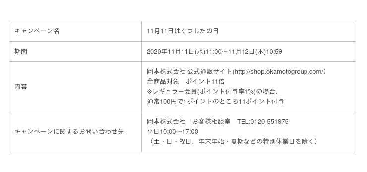 国内靴下売上高No.1(※2)のレッグウェア製造卸販売・岡本株式会社(本社:大阪市西区・本店:奈良県広陵町、代表取締役社長:岡本哲治)は、公式通販サイト(http://shop.okamotogroup.com/)にて、全商品のお買い上げポイントが11倍(※1)になる「11月11日はくつしたの日」キャンペーンを2020年11月11日(水)「くつしたの日」11:00から12日(木)10:59まで、期間限定で開催します。