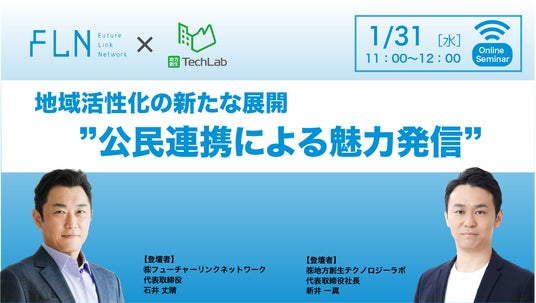 地域情報プラットフォームを通じた自治体事業実績を多数もつ株式会社フューチャーリンクネットワークと、民間企業と地方自治体の連携事業を支援する株式会社地方創生テクノロジーラボの取り組み事例をもとに、自治体との連携による地域の魅力発信・シティプロモーション事業のトレンドや、公民連携事業の必要性や可能性について、詳しく掘り下げていきます。