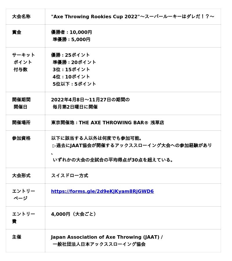 「"Axe Throwing Rookies Cup 2022"~スーパールーキーはダレだ!?~(以下、「当大会」)」とは、東京と大阪で毎月第2日曜日に開催される、初級者限定のAXE THROWING(斧投げ)の大会となります。当大会に参加、もしくは上位入賞することで、「斧投げ日本一決定戦。"Japan Axe Throwing Championship 2022 @TOKYO"」への出場権を獲得するために必要なサーキットポイントを貯めることができます。その他にも、参加者限定の特典として協会オリジナル斧とAXE THROWINGの利用料がセットになったお得なパッケージプランの購入や、上位2名までには賞金が与えらます。