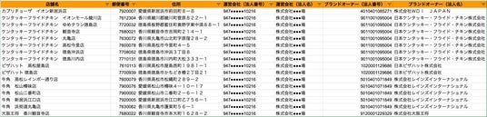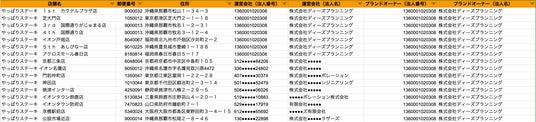 法人番号(運営会社)・運営会社名・運営会社の郵便番号・運営会社の住所・運営会社の電話番号・運営会社の代表者名・運営会社のwebsite・運営会社の従業員数・運営会社の資本金・運営会社の設立日・運営会社の売上・ブランドオーナーの法人番号・ブランドオーナーの会社名・ブランドオーナーの住所・ブランドオーナーの電話番号・ブランドオーナーのwebsite・グループ本社の法人番号・グループ本社の会社名・グループ本社の住所・グループ本社の電話番号・グループ本社のwebsite