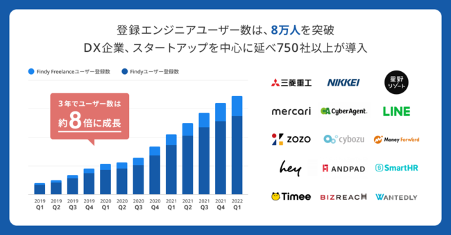 「Findy」「Findy Freelance」の登録ユーザー数は3年で約8倍成長し80,000人を突破、導入企業数は750社を超え、スタートアップからDXを推進したい大手企業まで幅広い企業に導入していただいております。昨年ローンチした「Findy Teams」も順調に導入社数を伸ばし続けており、トライアル利用企業数は100社を超えました。
