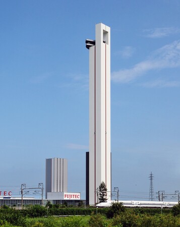 エレベータ研究塔は、本社ビッグウィングに2006年11月に開設されました。地上高さが170mで、塔内には13台のエレベータを設置し、エレベータの研究施設として世界最大級の高さと規模を誇るものです。ここでは、超高速機種のテストをはじめ、世界に先駆けた独創的な新技術・新商品の研究・開発を行っています。