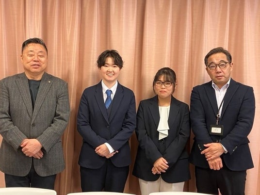 写真左からSAKURA United Solution(株)代表取締役・井上、木村亜美選手、BPOオンサイト所属・影山、専務取締役・森重、SAKURA United Solution本社にて撮影
