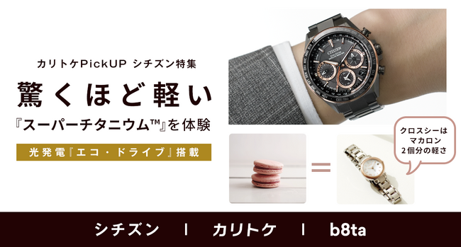 ななし株式会社(本社:大阪市北区 代表取締役:小山力也)が運営するブランド腕時計のサブスクリプションサービス「カリトケ(KARITOKE)」は、9月1日から1ヶ月間、シチズン時計株式会社の独自素材である『スーパーチタニウム(TM)』を採用したモデルをピックアップし、体験型ストア「b8ta Tokyo - Yurakucho」に出品いたします。