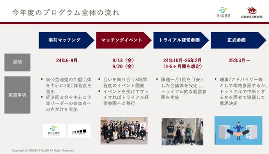 本活動のキックオフとして、2024年9月13日(金)・20日(金)の2日間で、参画候補者と受入希望NPOが互いを知り、協働の可能性を模索するボードマッチイベントを経済同友会と共同にて開催します。