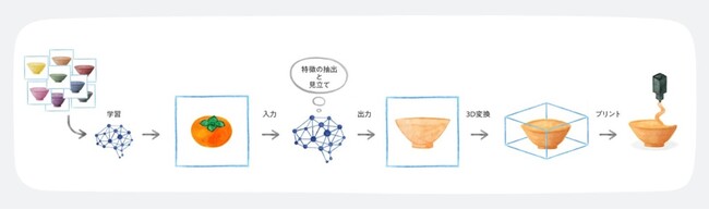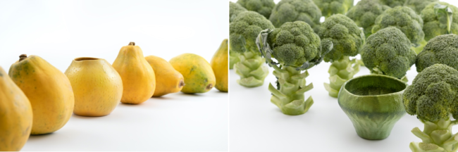 例えばパパイアの画像を入力すると、パパイアのような特徴を持った器の画像を、ブロッコリーの画像を入力すると、ブロッコリーのような特徴を持った器の画像をmitate AIが生成します。ニューラルネットワークの特性上、生成される器の画像は、まるで実際の器の焼成で現れる“景色”のように色も形も毎回異なります。そのランダムに生み出される画像の中から美しいものをデザイナーが選出、アウトラインを元に3Dデータ化し、高精細のフルカラー3Dプリンタ「Jシリーズ」で造形、プロダクトとして具現化します。