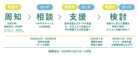 奈良市民の登録者数や相談件数、相談内容の傾向や支援実績等のデータを集め、2025年3月までの実態を把握していきます。そこで見えてきた課題を抽出し、両者で検討しながら運用に活かすサイクルで1年間連携していきます。