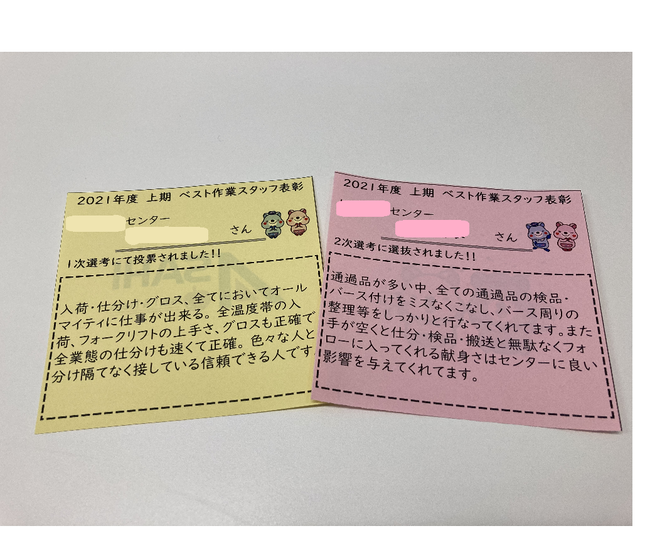 【目的】倉庫内作業はチーム単位で業務遂行することから、作業性だけでなく人間性や協調性も評価の基準とし、共に働く作業スタッフから「頑張っている人」の推薦による選出を行う。これにより、モチベーションの向上、同僚・仲間からの推薦を加味することで団結力や一体感の向上につなげる。