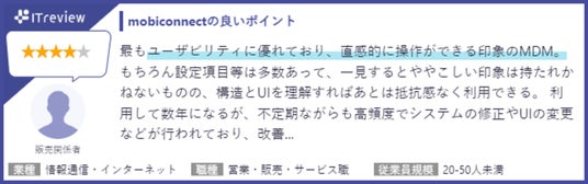 ITreviewでは、モバイルデバイス管理サービス(MDM)「mobiconnect」を活用いただいている企業や学校・教育委員会などから、多くのお声が寄せられております。お客さまからは「直感的に操作できる」「サポートの対応が早い」などのコメントをいただきました。