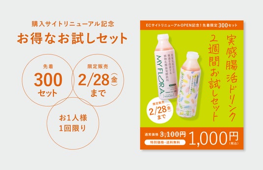 サイトリニューアルを記念し、『2週間お試しセット』を期間限定で特別価格1,000円(税込・送料無料)にてご提供いたします。実感腸活ドリンク「シンバイオティクス マイ・フローラ」「マイ・フローラ サラダ」2種を飲み比べていただけるセットです。ぜひ、味の違いやおなかの変化などを体感いただく機会としてご活用ください。(*~2025年2月28日までの期間限定企画)