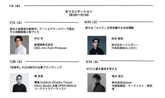 左上から時計回りに杉山 央(新領域株式会社/ CEO, Art+Tech Producer)、榊 良祐( 電通 Creative Director・Future Vision Studio 主催・OPEN MEALS フードテックアーティスト)、井上 裕太(KESIKI Executive Director・Kepler 取締役COO/CFO・Whatever CorpDev Director)、辻 愛沙子(株式会社arca/ CEO / Creative Director)、ジャンリュック・コロナ・ディストリア(リテール専門家・デザインキュレーター・日本愛好家)、遊佐 淳平( NOT A HOTEL株式会社/ Brand Director)、徳井 直生(株式会社Qosmo/代表取締役・アーティスト・研究者)、松田 崇弥(株式会社ヘラルボニー/代表取締役Co-CEO)