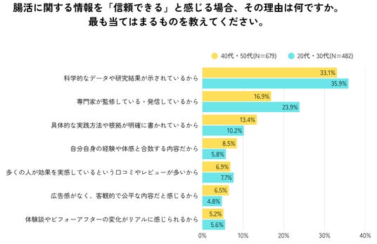 「科学的なデータや研究結果が示されているか」は、20~30代が35.9%、40~50代は33.1%となりました。次いで、「専門家が監修している・発信しているから」が20~30代は23.9%、40~50代は16.9%と続き、世代間では20~30代の方が7.0ポイント高くなっています。40~50代は「具体的な実践方法や根拠が明確に書かれているから」(13.4%)、「自分の経験や体感と合致する内容だから」(8.5%)が、20~30代よりも高くなりました。