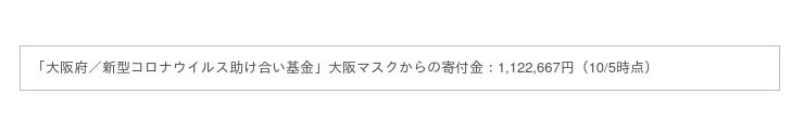 吉村知事が4月より行っています「大阪府/新型コロナウイルス助け合い基金」への大阪マスク売上金からの寄付は1,122,667円(10/5時点)になりました。先日販売させて頂きました分に関しましても寄付申請します。