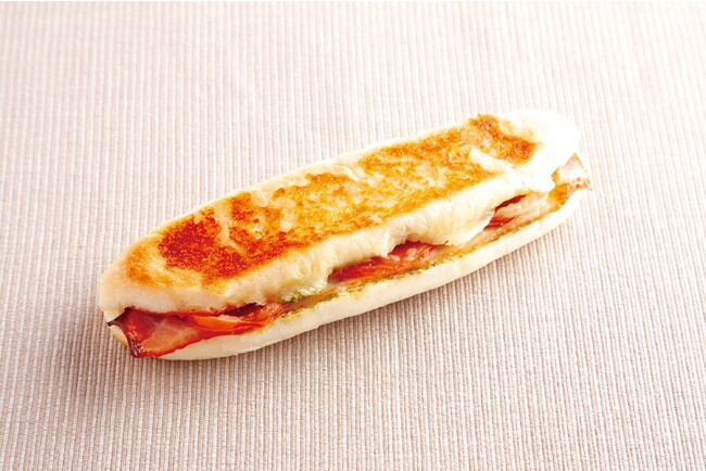 パンにバジルペーストを塗り、ベーコン・トマト・チーズと一緒にサンド。具材の旨味がぎゅっと詰まったバジル香るイタリアンテイストのパニーニ。