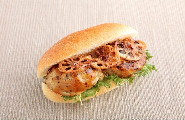 炭火焼きつくねに照り焼きソースをかけ、自家製のレンコンチップをトッピング。ふっくら大きなつくねとレンコンチップのパリパリ食感が楽しめるコッペパン。