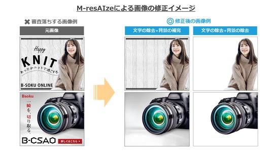 M-resAIzeは、画像修正AIを活用してWeb広告で審査落ちしたバナーを修正する際にかかる工数を、軽減することが可能です。