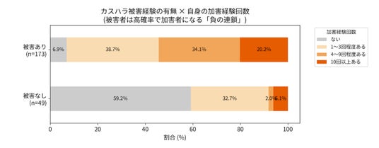 一方で、被害経験がない人の加害率は40.8%にとどまっており、この結果から、B2Bカスハラは、被害が別の取引先への要求として伝播する「連鎖構造」を持つ可能性が示唆されました。